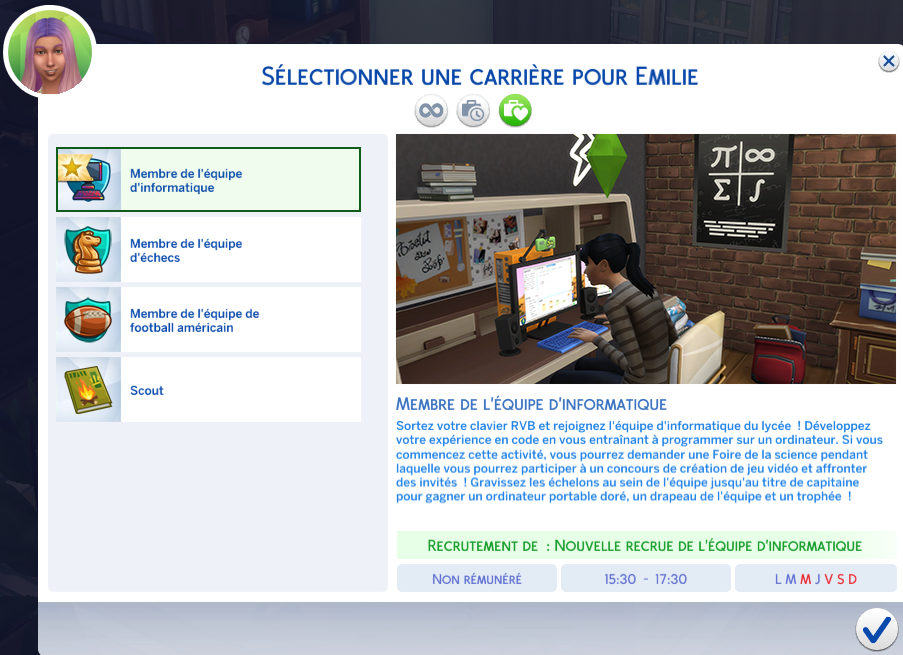 - Membre de l’équipe informatique : qui développe la compétence programmation, permet de participer à des compétitions de jeux vidéo. Elle débloque également un ordinateur doré si nous atteignons le niveau max.