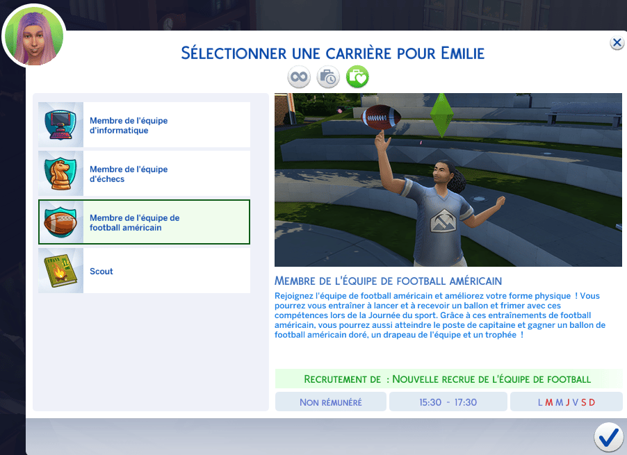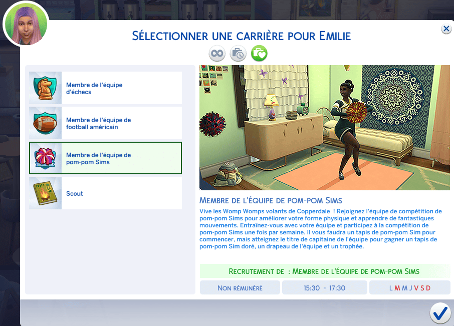 - Membre de l’équipe de pom-pom Sims : développe la compétence physique et débloque un tapis d’entraînement doré au niveau max.