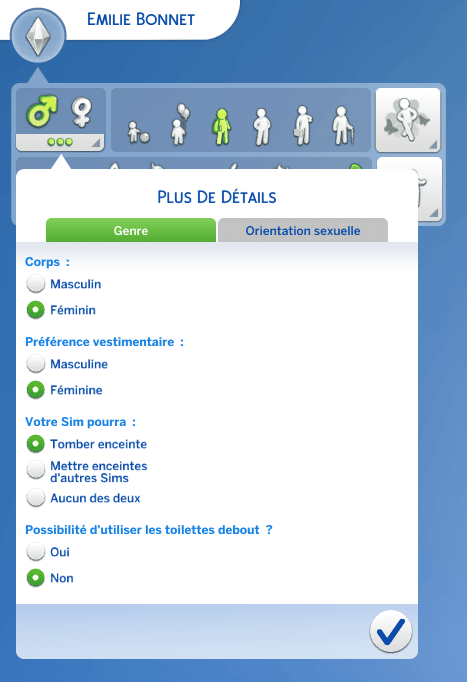 En effet, nous avons la possibilité de définir un genre différent, à notre sim, de l’éternel choix homme/femme. Dans le CUS, à la sélection du sexe de notre sim, nous avons maintenant différentes options. Nous pouvons avoir notre sim féminin, au corps masculin, qui préfère s’habiller de manière masculine ou féminine. De choisir si iel peut tomber enceinte ou mettre enceinte, ou alors aucune de ces deux options.