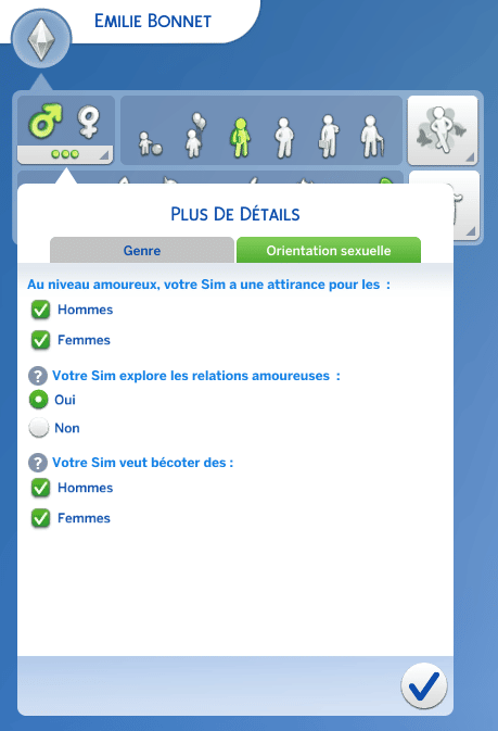 Nous avons également la possibilité de détailler l’orientation sexuelle. A savoir qu’il est possible à votre sim de se renseigner sur l’orientation des autres par une simple action amicale. En effet, un sim qui ne correspond pas aux attirances d’un autre se verra gentiment recalé par ce dernier.