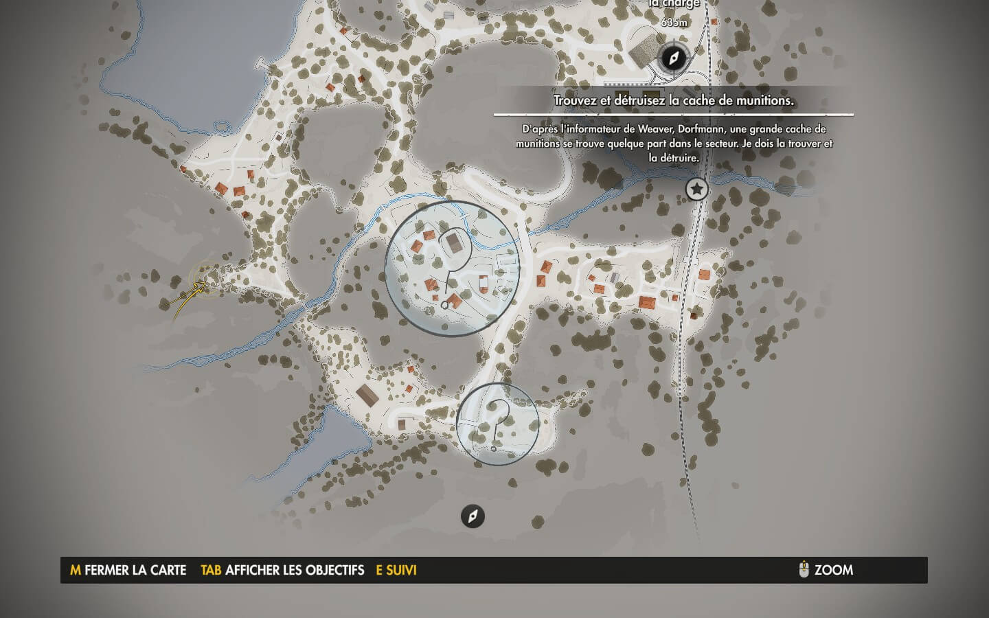 La carte de la troisième mission. La flèche jaune indique l’endroit où nous débutons la mission. Le point étoilé est l’objectif principal de celle ci.