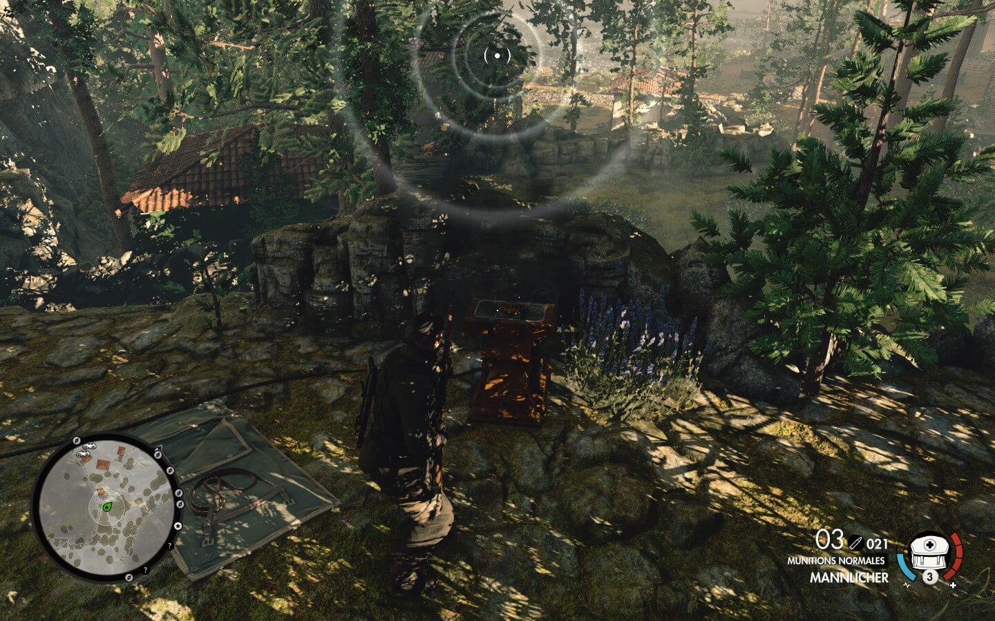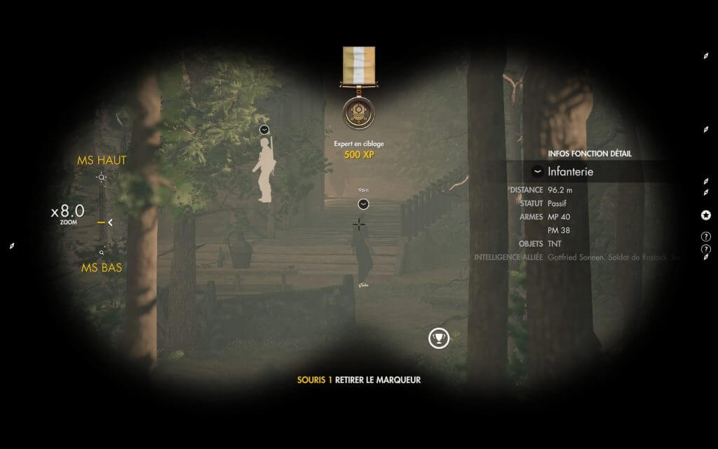 Repérer les lieux à l’avance grâce à vos jumelles vous permettra de mettre un marqueur sur beaucoup d’éléments, que ce soit les soldats nazis qui garderont le marquage quand ils se déplaceront, les véhicules avec leur état, ainsi que les bidons d’explosifs et autres mécanismes en tout genre. Vous pouvez d’ailleurs interagir avec plusieurs de ces éléments pour vous dissimuler, camoufler le bruit de vos tirs, ou les piéger selon votre volonté et votre stratégie . Il faudra parfois nettoyer toute une zone un peu éloignée de votre but car celle ci deviendra un excellent point de tir à longue portée en minimisant le risque d’être repéré ou encerclé. En résumé, l’aspect stratégique de ce FPS n’est pas seulement important, il est vital. Et honnêtement, plutôt bien intégré au jeu.