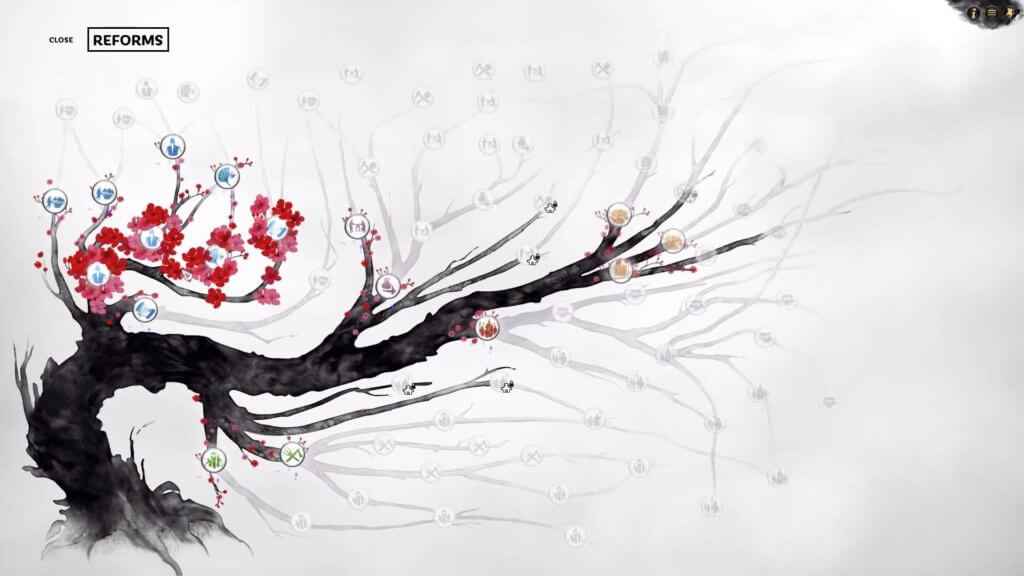 L’exemple le plus parlant est, pour moi, l’arbre des « technologies », qui sont ici des réformes : il s’agit d’un véritable arbre, où les branches bourgeonnent de recherches à accomplir. Chaque accomplissement provoquera une explosion de fleurs sur ladite branche ce qui est, on en convient, absolument magnifique.