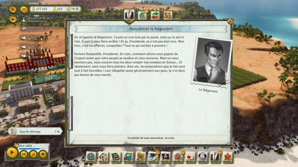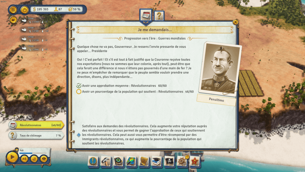 Quelque chose que j’ai trouvé assez dommage dans Tropico 6 est le système de quêtes nous permettant d’atteindre les ères suivantes, car oui, le jeu s’étale sur 4 périodes. On se sent assez limité, et ça enlève un peu de l’unique qu’a nos parties. Mais Tropico reste toujours très captivant, et possède une grosse durée de vie compte tenu des missions proposé par la campagne.