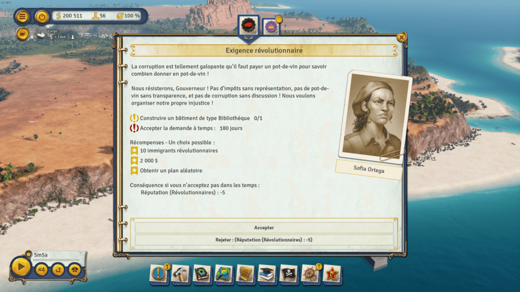 • Votre aventure sur Tropico sera régulièrement ponctué par un personnage, représentant d’une faction, qui va vous demander de réaliser un quête en échange d’une récompense. Dans les 3/4 du temps il vous est demandé de construire un bâtiment, et en plus de gagner de la réputation auprès de la faction que vous avez aidé, vous pouvez repartir avec une somme d’argent ou encore avec des immigrants qui deviendront des citoyens tropiquiens. ATTENTION : vos actions on constamment une influence sur votre réputation avec les factions, même dehors des quêtes !