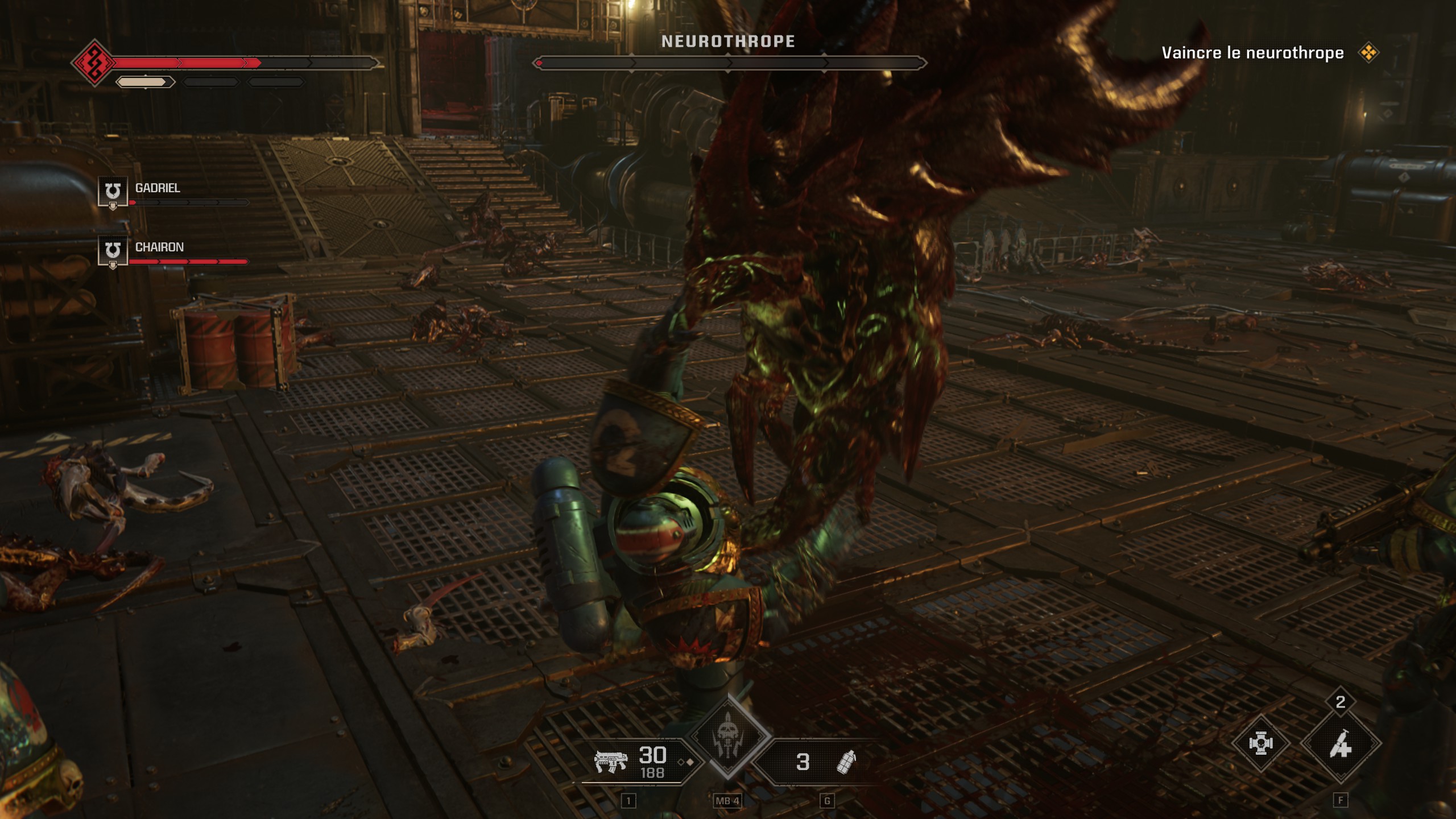 Il faut ensuite terminer par un point négatif qui relève autant de la sémantique que du subjectif, et n’affectera donc pas tout le monde : le TPS. En tant que third-person shooter, Space Marine 2 devrait en toute logique nous proposer de tirer sur une multitude d’ennemis avec un arsenal varié. Ce n’est que rarement le cas, puisque les mécaniques et le manque de munitions poussent Demetrian Titus à passer le plus clair de son temps au corps-à-corps, enchaînant les combos qui régénèrent l’armure et le exécutions en slow motion. Si ces dernières sont particulièrement bien réalisées, il n’ne reste pas moins que le rythme du jeu est perturbé par ces démonstrations de talent à l’épée tronçonneuse.