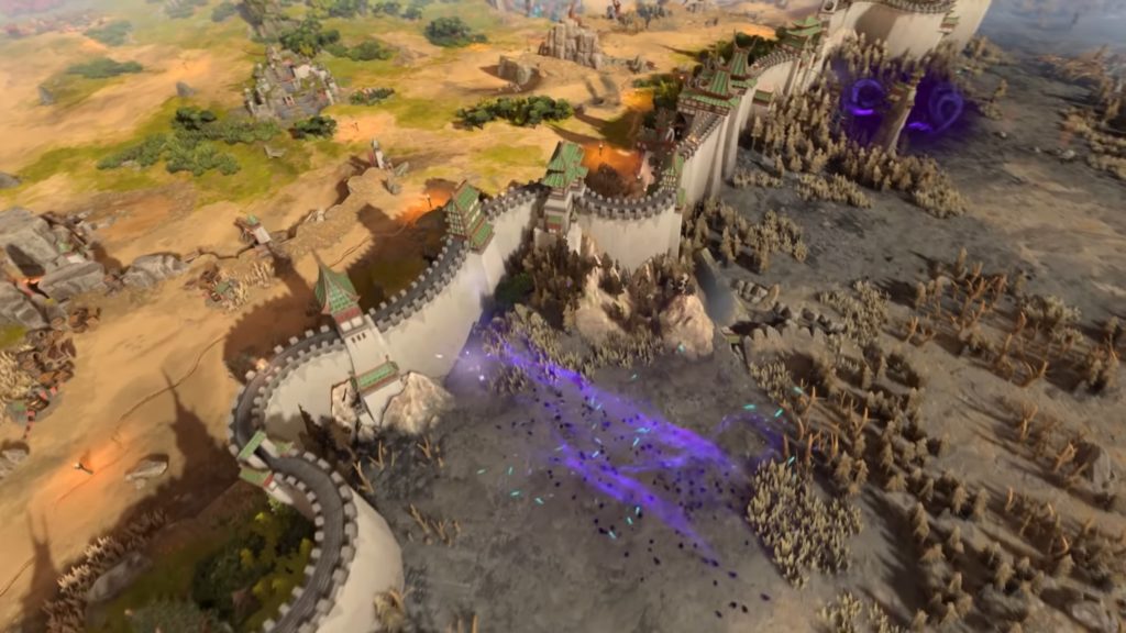 On notera que la map de Total War : Warhammer 3 paraît plus colorée que celle des précédents opus, et offre aussi de nombreux points d’étranglement aux intéressantes opportunités stratégiques. Néanmoins, on ne peut s’empêcher de noter l’absence des Nains du Chaos et de leur royaume de cendres.