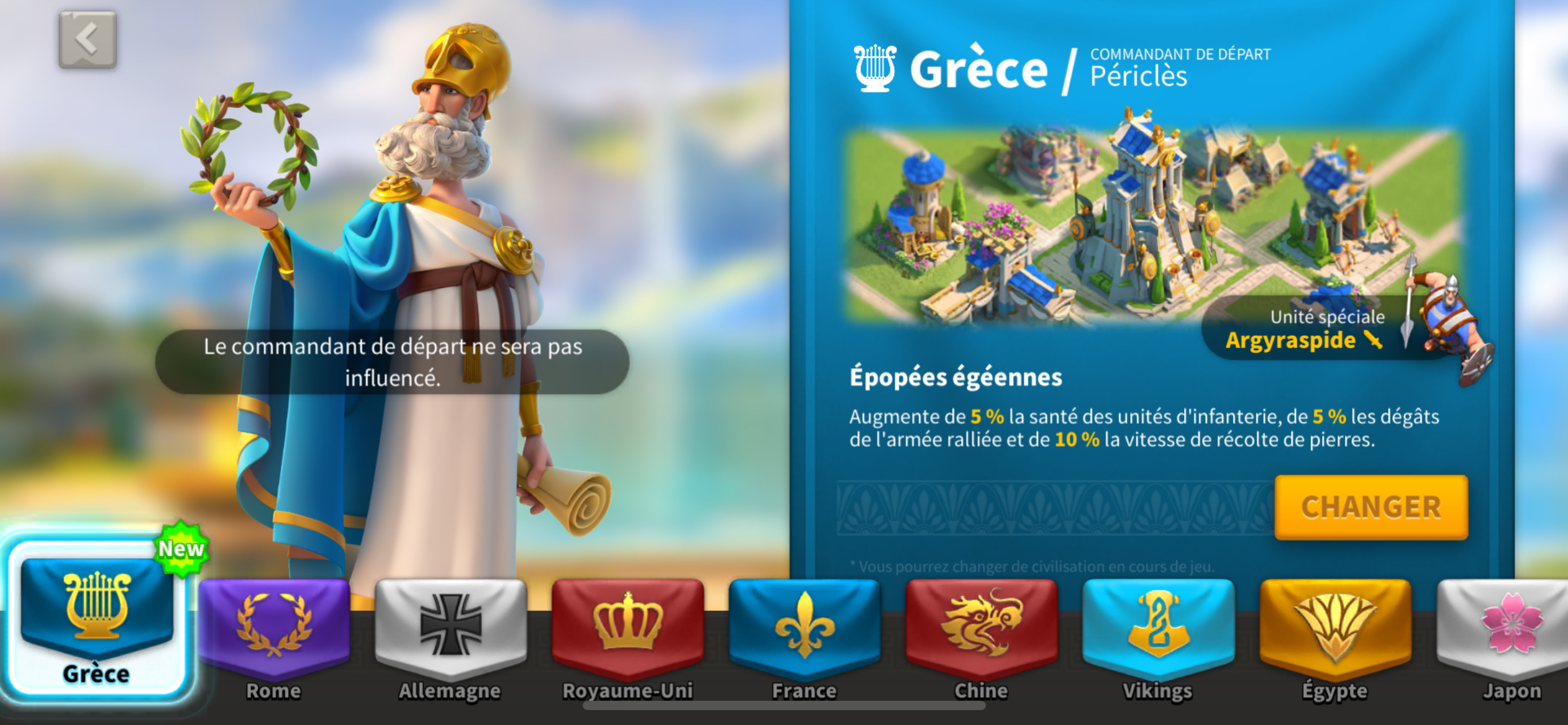 Si vous êtes un nouveau joueur, il y a des civilisations bien meilleures qui vous aideront dans votre progression et vos recherches. Choisissez donc la Grèce uniquement si vous aimez le style artistique et les modèles.