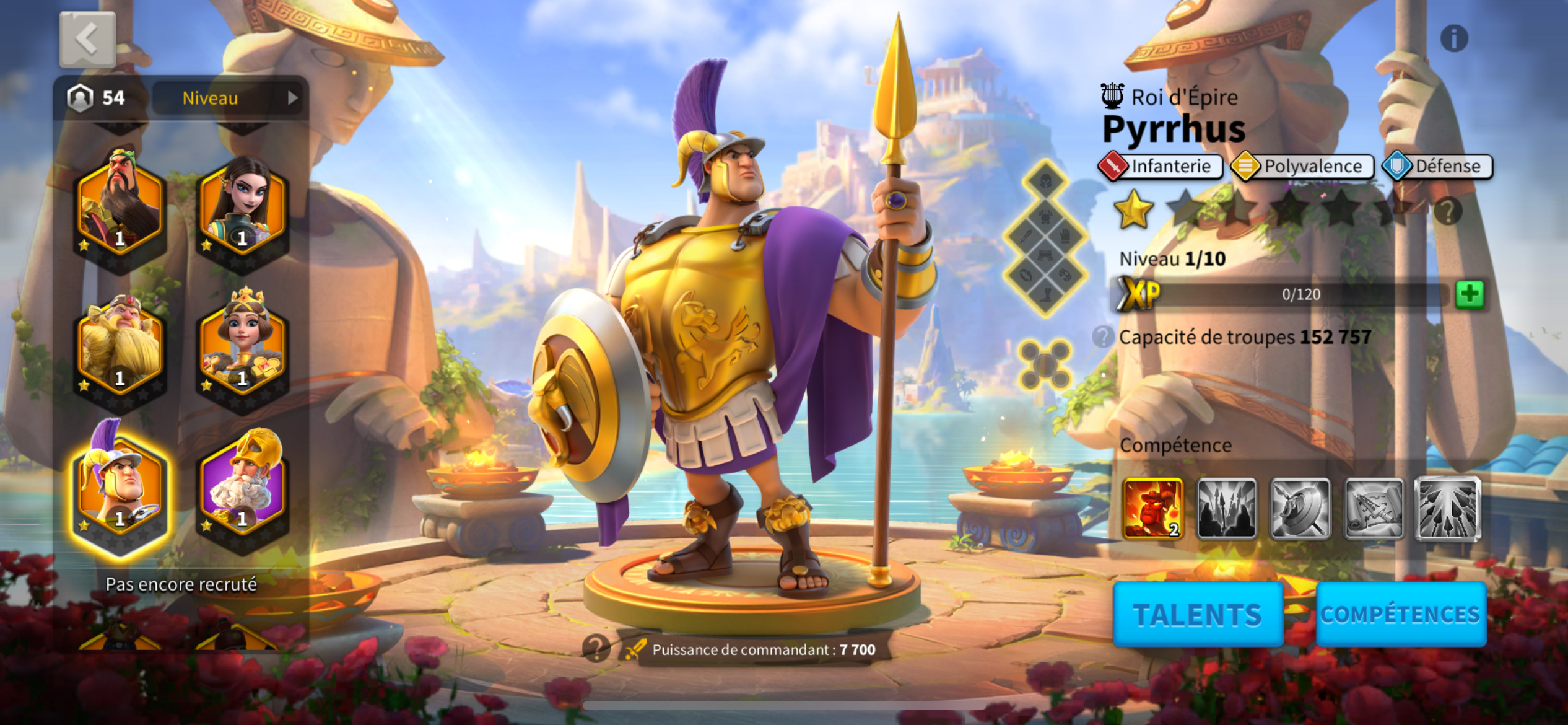 Pyrrhus est un excellent commandant uniquement parce qu’il peut être obtenu grâce à des clés d’or, et grâce à l’event de lancement de cette nouvelle civilisation. Nous ne vous recommandons pas de dépenser vos sculptures de commandant légendaire pour lui, mais il pourra naturellement être monté ; associé à Charles Martel, il pourra former une paire gratuite hautement efficace pour les premières saisons !
