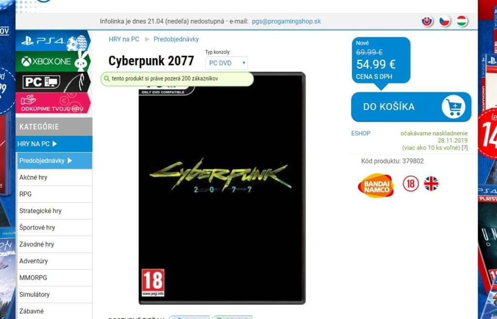 Pourtant, le site slovaque Pro Gaming Shop semble tabler pour une date de sortie le 28 novembre 2019, ce qui est mine de rien assez proche ! La page du magasin en ligne dédiée à Cyberpunk 2077 affiche en effet cette date, et c’est assez étrange : dès leur annonce, beaucoup de jeux sont mis en vente sur les grandes enseignes (Amazon, Micromania, Fnac, Uryzen…) en tant que placeholder. C’est-à-dire qu’on peut les pré-commander et que la date de sortie affichée est généralement le 31 décembre de la même année, en attendant que l’éditeur ne donne plus de détails.