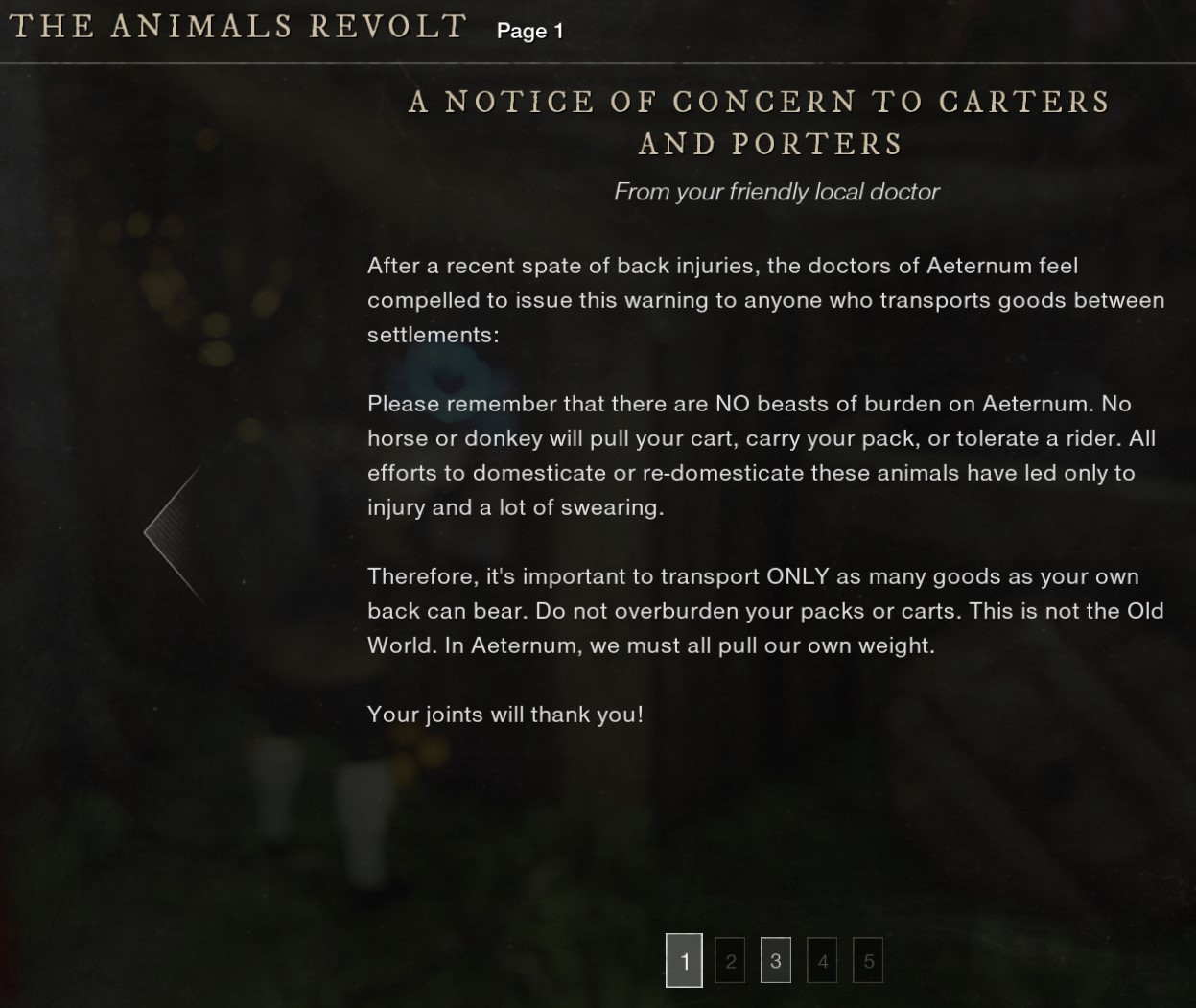 Une première se trouve dans le lore ; comme expliqué dans une note in-game, que vous pouvez retrouver ci-dessous, les animaux de transports comme la mule et le cheval ont quelques problèmes de folie en arrivant à Aeternum. La cause semble en être la Terre Enragée, qui n’est autre que la manifestation élémentaire de l’île contre l’Altération.