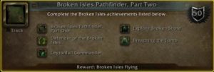 Dans la même optique que sur l’extension précédente, la première partie du Meta Haut Fait demandait d’explorer la totalité des îles brisées, de terminer les scénarios des cinq différentes zones (Oui, Suramar comprit !), d’accomplir une centaine d’expéditions différentes, de terminer la campagne du domaine de votre classe, et bien sûr de passer par le farm de réputation pour être révéré auprès des 6 factions des îles (Haut Roc, Valarjar, Tisses-Rêves, Cour de Farondis, Les Souffrenuits et Les Gardiennes). Cette première partie, mis à part être indispensable pour le futur Haut Fait débloquant le Vol, nous offrait tout de même une vitesse de monte améliorée de 30% sur le nouveau continent !