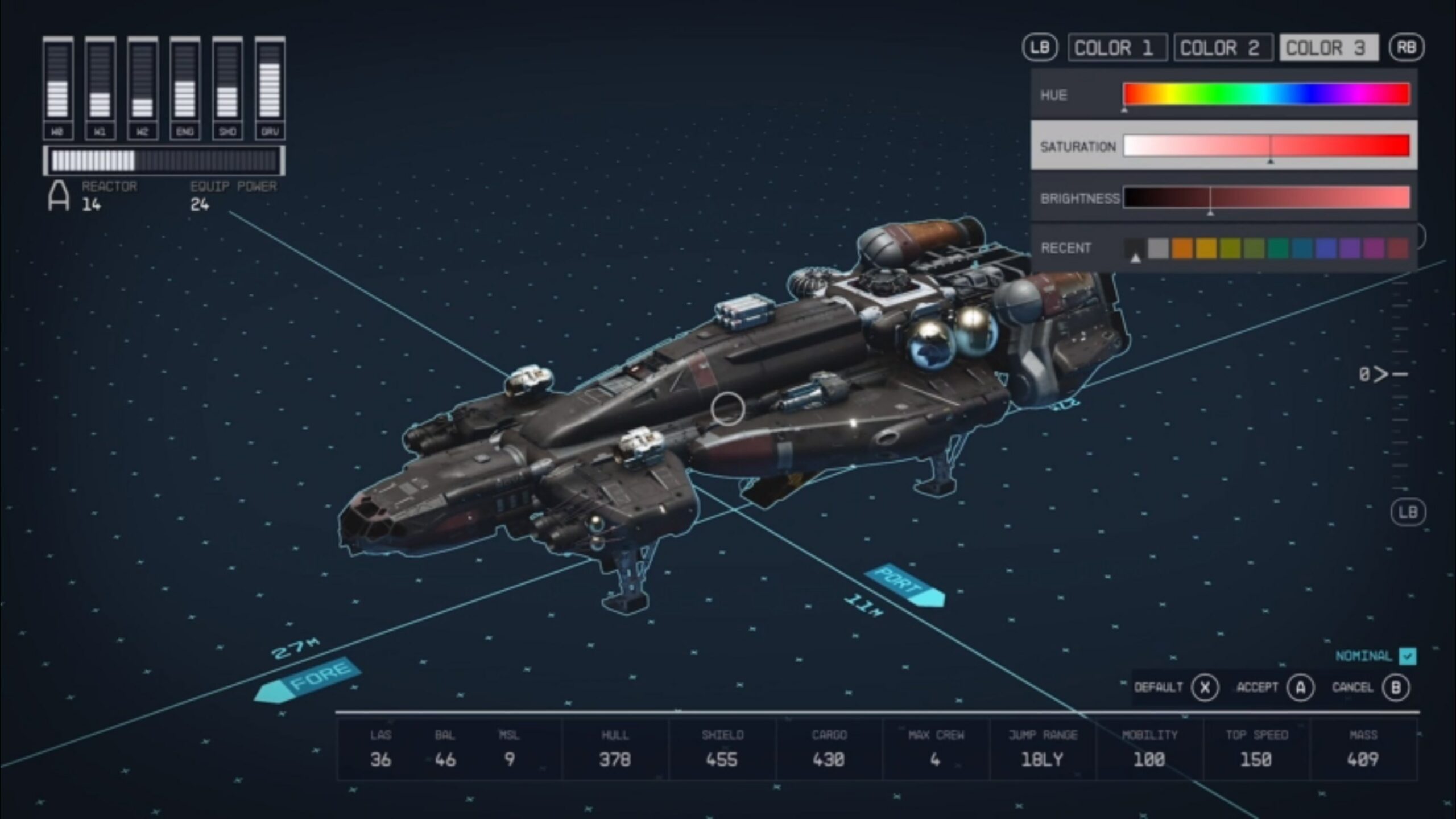 D’après ce que nous pouvons voir du mode de construction de vaisseaux, il semble que c’est là que vous allez personnaliser votre vaisseau en termes de vitesse, de mobilité, de portée de saut et d’espace de chargement – autant d’éléments importants pour notre exploration interstellaire. Cela signifie que la manière dont vous personnalisez votre vaisseau ici aura très certainement un impact sur le type de missions que vous pourrez accomplir ailleurs. C’est également là que vous pourrez personnaliser l’apparence de votre vaisseau, au-delà des pièces et des éléments qui le composent réellement, jusqu’à la peinture finale